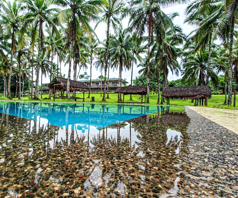 Swimming Pool with Cottage, Lounge Chairs, and Hammocks with Pillow